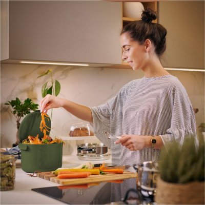Når du begynder med en tom Bokashi kompostbeholder, starter du med at drysse et tyndt lag Bokashi-klid i bunden. Derefter tilsætter du køkkenaffald lidt efter lidt. Hver gang du lægger nye madrester i beholderen, fordeler du igen et jævnt lag klid ovenpå og presser affaldet let ned, inden låget lukkes tæt.