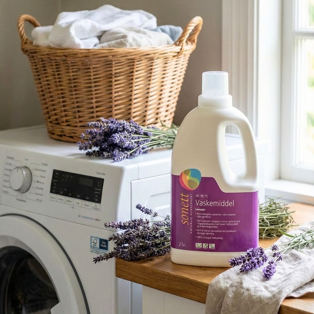 Med dette vaskemiddel fra Sonett, kan du vaske dit tøj skånsomt med økologiske planteoliesæber og sukkertensider.