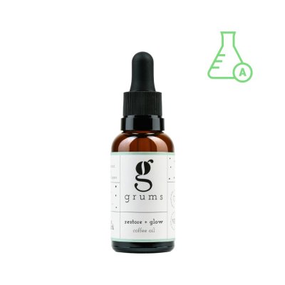 Restore + Glow Coffee Oil fra grums er en 100 % upcycled ansigtsolie, udviklet i grums’ eget laboratorium i Aarhus. Olien er koldpresset og udvundet af genanvendt kaffegrums – en potent og naturligt aktiv ingrediens rig på antioxidanter og antiinflammatoriske stoffer, der styrker, beskytter og forfiner huden.