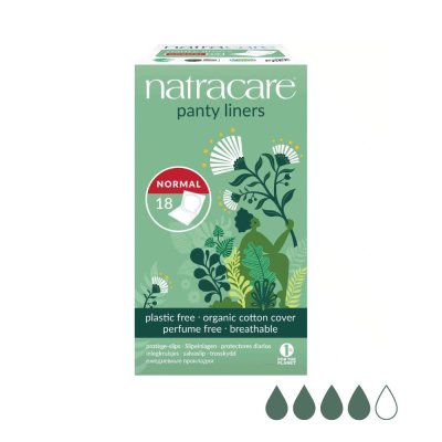 Natracare's trusseindlæg er lavet af 100% økologisk bomuld pakket i bionedbrydeligt pap og papir trykt med plantebaseret farve.